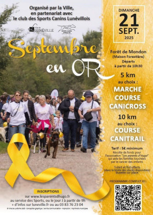 Moncel-lès-Lunéville rue de Mondon, Moncel-lès-LunévillePour la deuxième année consécutive, la ville de LUNÉVILLE, en collaboration avec le Club des Sports Canins Lunévillois, organise l’événement SEPTEMBRE EN OR, dédié à la lutte contre le cancer pédiatrique. L’intégralité des fonds collectés sera reversée à l’association Les Parents d’Hugo.Au programme, plusieurs façons de contribuer à cette noble cause :👉 Participation : à […]